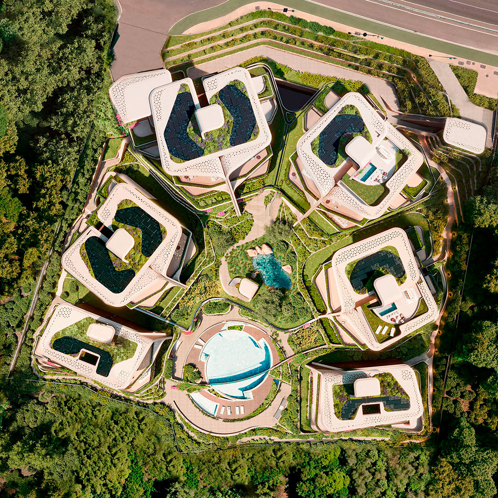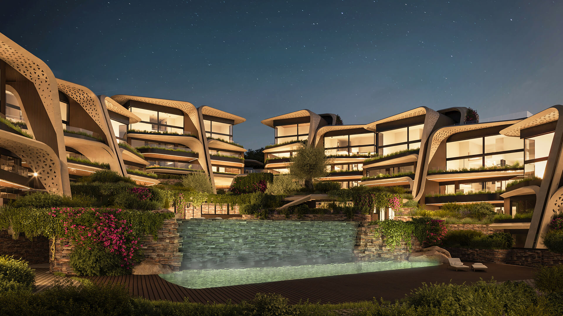 Over 1,600 m² of communal facilities are dedicated to wellness and lifestyle, including two outdoor swimming pools separated by a waterfall feature, an indoor heated pool, a fitness centre overlooking the gardens, a coworking lounge, gastrobar, and landscaped gardens incorporating a natural stream. The entrance lobby spans 700 m² and creates a serene and immersive arrival experience.